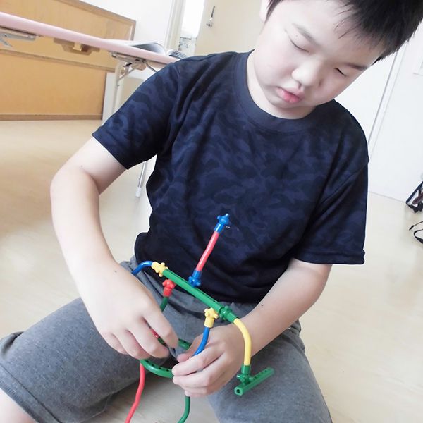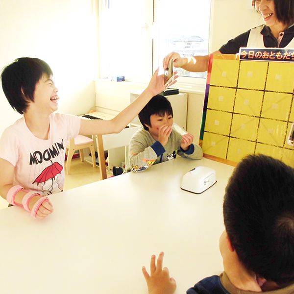 目標に合わせて、個別または小集団での療育を行います。個別の活動の中で、集中力をつけたり、小集団の中でお友達と一緒にルールのあるゲームをしたり、ごっこ遊びの中で、社会性、協調性を養います。工作などを行い、書く・切る・貼る・折るなど作業を無理なく楽しく出来るよう支援します。